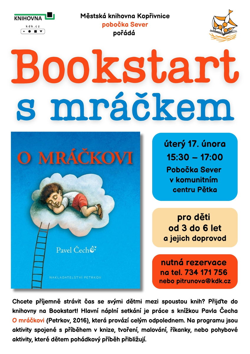 Chcete příjemně strávit čas se svými dětmi mezi spoustou knih? Přijďte do knihovny na Bookstart! Hlavní náplní setkání je práce s knížkou Pavla Čecha "O mráčkovi" (Petrkov, 2016), která provází celým odpolednem. Na programu jsou aktivity spojené s příběhem v knize, tvoření, malování, říkanky, nebo pohybové aktivity, které dětem pohádkový příběh přibližují.