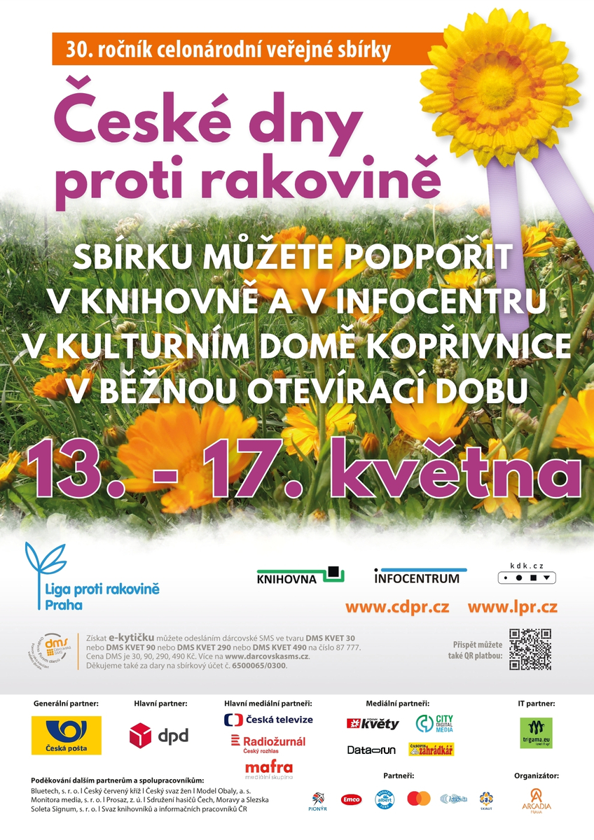 Podpořit letošní sbírku Ligy proti rakovině můžete zakoupením symbolické žluté květiny měsíčku lékařského v běžnou provozní dobu ve čtvrtek a pátek v knihovně v kulturním domě a od středy až do neděle v informačním centru tamtéž.