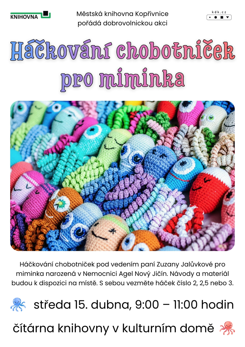 Háčkování chobotniček pod vedením paní Zuzany Jalůvkové pro miminka narozená v Nemocnici Agel Nový Jičín. Návody a materiál budou k dispozici na místě. S sebou vezměte háček číslo 2, 2,5 nebo 3.