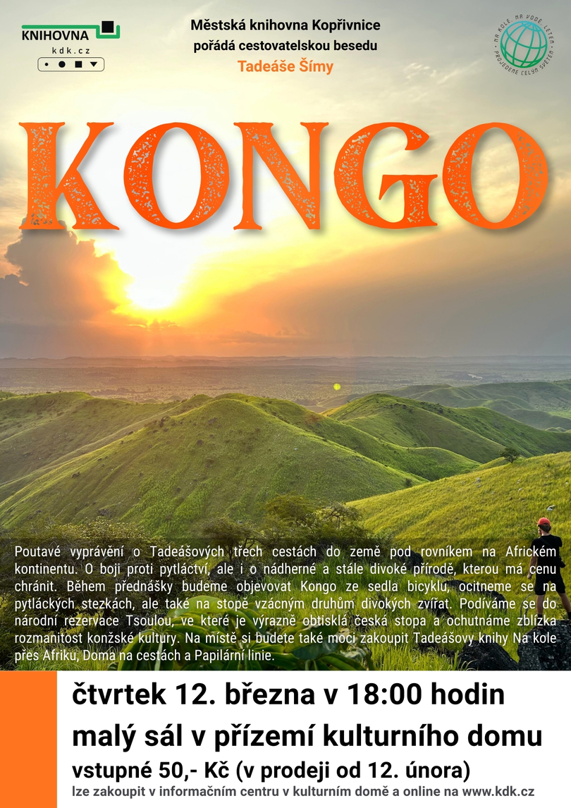 Poutavé vyprávění o Tadeášových třech cestách do země pod rovníkem na Africkém kontinentu. O boji proti pytláctví, ale i o nádherné a stále divoké přírodě, kterou má cenu chránit. Během přednášky budeme objevovat Kongo ze sedla bicyklu, ocitneme se na pytláckých stezkách, ale také na stopě vzácným druhům divokých zvířat. Podíváme se do národní rezervace Tsoulou, ve které je výrazně obtisklá česká stopa a ochutnáme zblízka rozmanitost konžské kultury. Na místě si budete také moci zakoupit Tadeášovy knihy Na kole přes Afriku, Doma na cestách a Papilární linie.