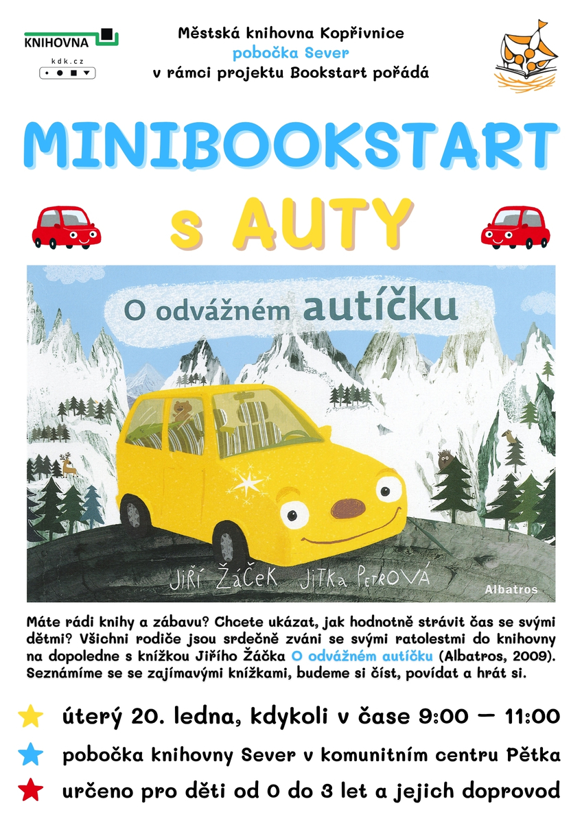Máte rádi knihy a zábavu? Chcete ukázat, jak hodnotně strávit čas se svými dětmi? Všichni rodiče jsou srdečně zváni se svými ratolestmi do knihovny na dopoledne s knížkou Jiřího Žáčka O odvážném autíčku (Albatros, 2009). Seznámíme se se zajímavými knížkami, budeme si číst, povídat a hrát si.
