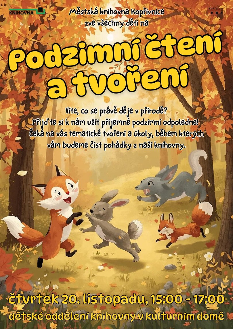 Víte, co se právě děje v přírodě? Přijďte si k nám užít příjemné podzimní odpoledne! Čeká na vás tematické tvoření a úkoly, během kterých vám budeme číst pohádky z naší knihovny.