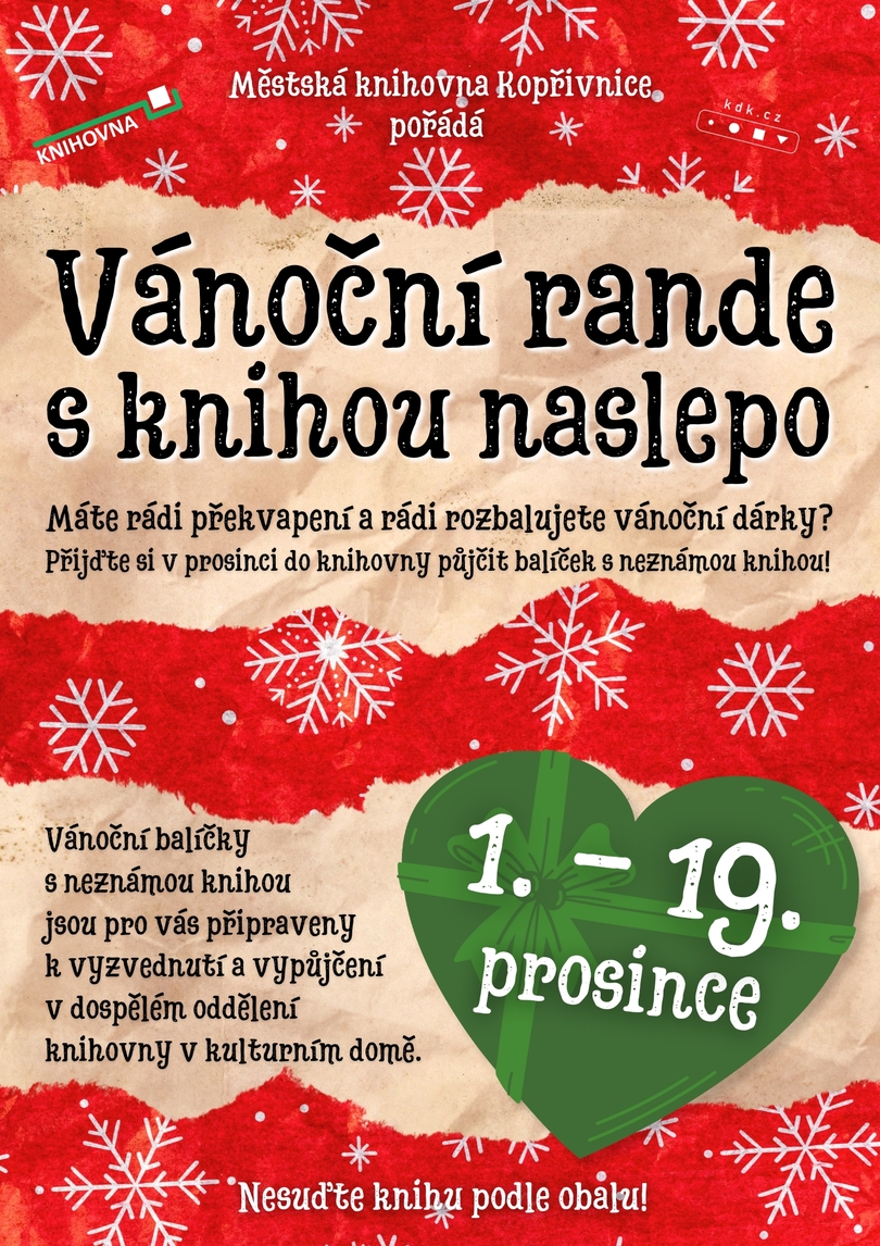 Vánoční balíčky s neznámou knihou jsou pro vás připraveny k vyzvednutí a vypůjčení v dospělém oddělení knihovny v kulturním domě od 1. do 19. prosince.
