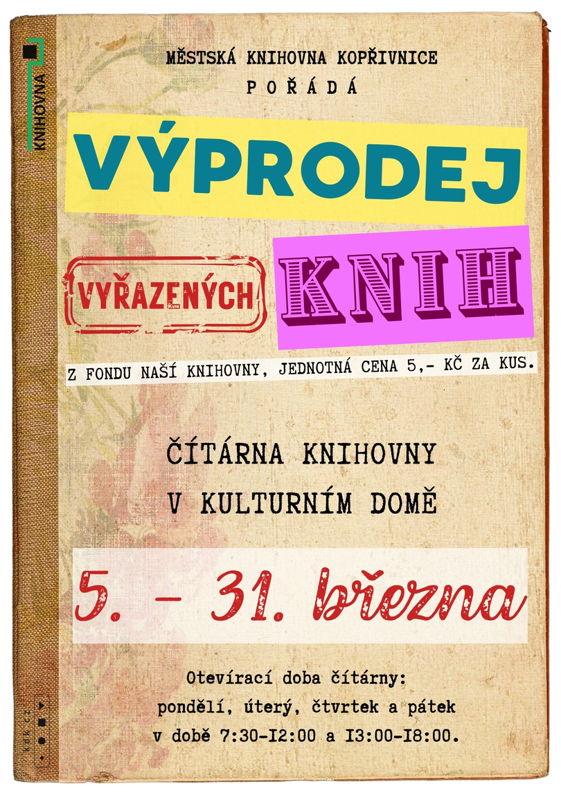 Knihy vyřazené z fondu naší knihovny se budou prodávat za jednotnou cenu 5,- Kč za kus v čítárně knihovny v kulturním domě během její otevírací doby: pondělí, úterý, čtvrtek a pátek v době 7:30 – 12:00 a 13:00 - 18:00.