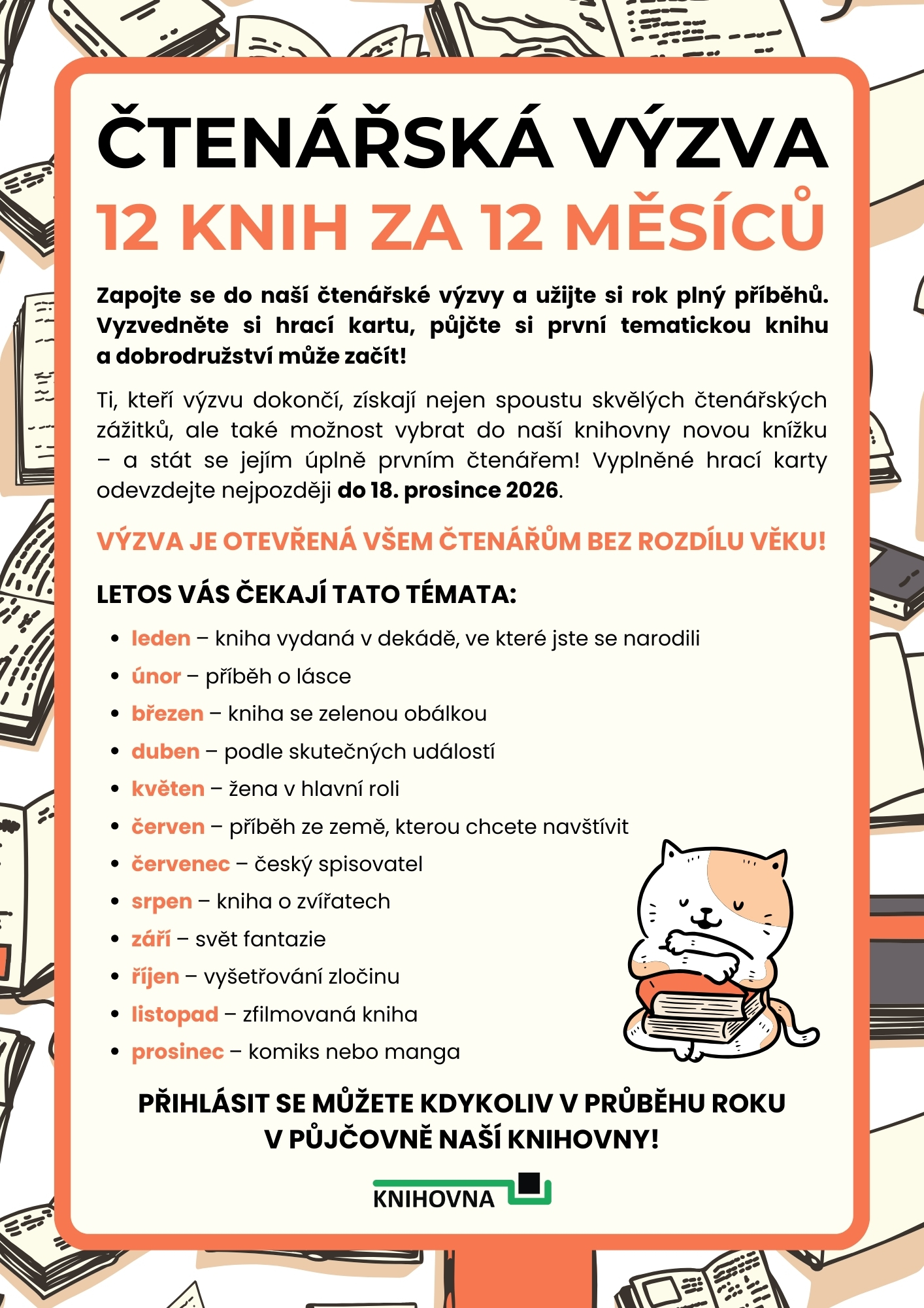 Ti, kteří výzvu dokončí, získají nejen spoustu skvělých čtenářských zážitků, ale také možnost vybrat do naší knihovny novou knížku a stát se jejím úplně prvním čtenářem! Vyplněné hrací karty odevzdejte nejpozději do 18. prosince 2026.