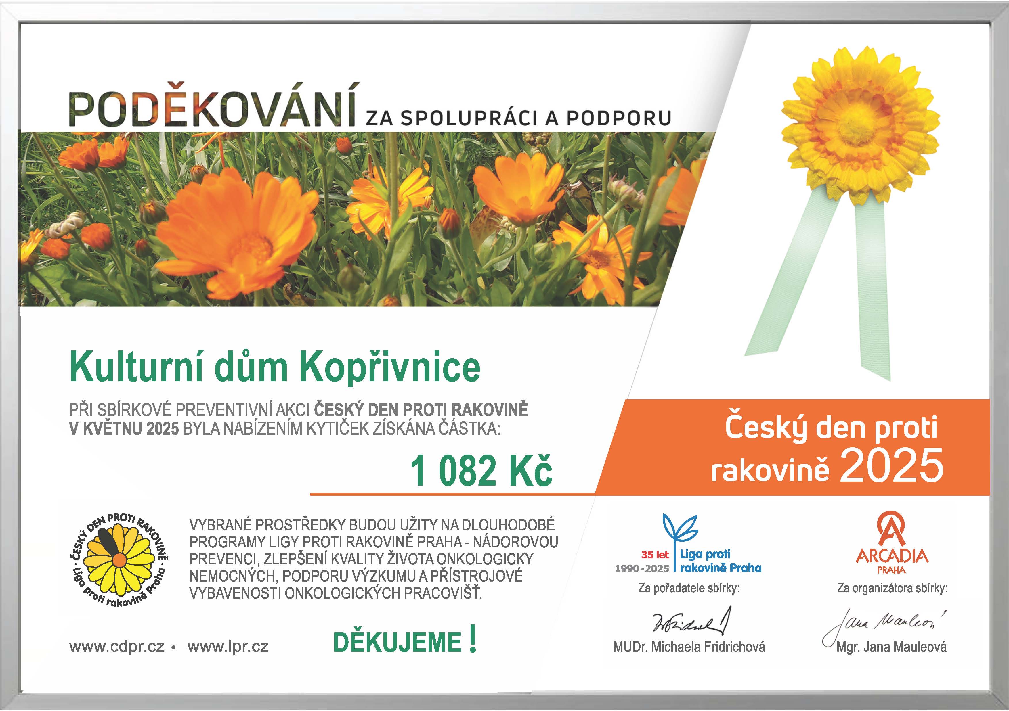 Děkujeme, že jste se spolu s námi i letos zapojili do květnové sbírky a podpořili dobrou věc v rámci Českých dnů proti rakovině 2025! Vybraná částka podpoří programy Ligy proti rakovině Praha.