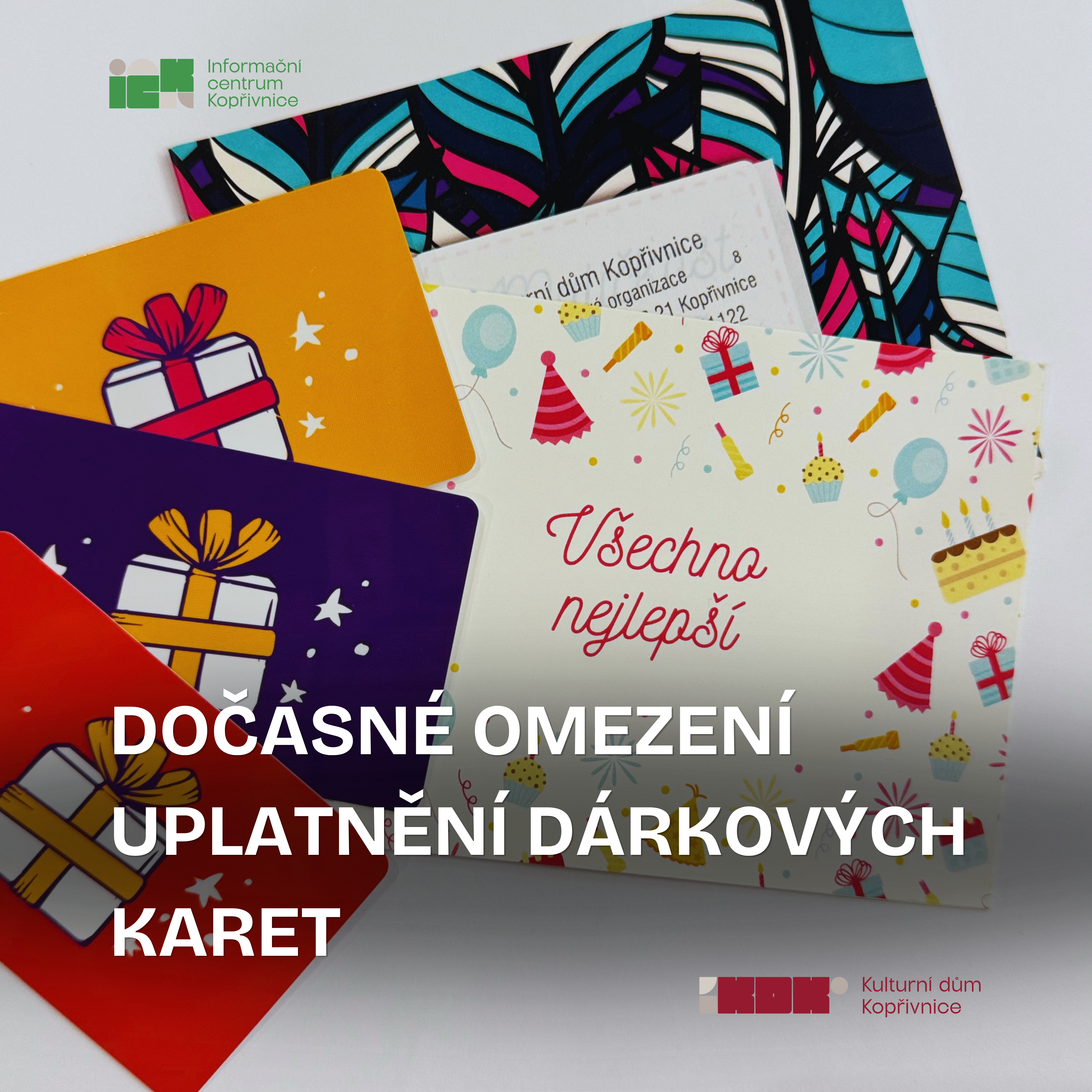 V případě, že vám toto omezení nevyhovuje, nabízíme možnost vyplacení hodnoty dárkové karty v hotovosti na pokladně Informačního centra Kopřivnice, a to v rámci jeho otevírací doby.