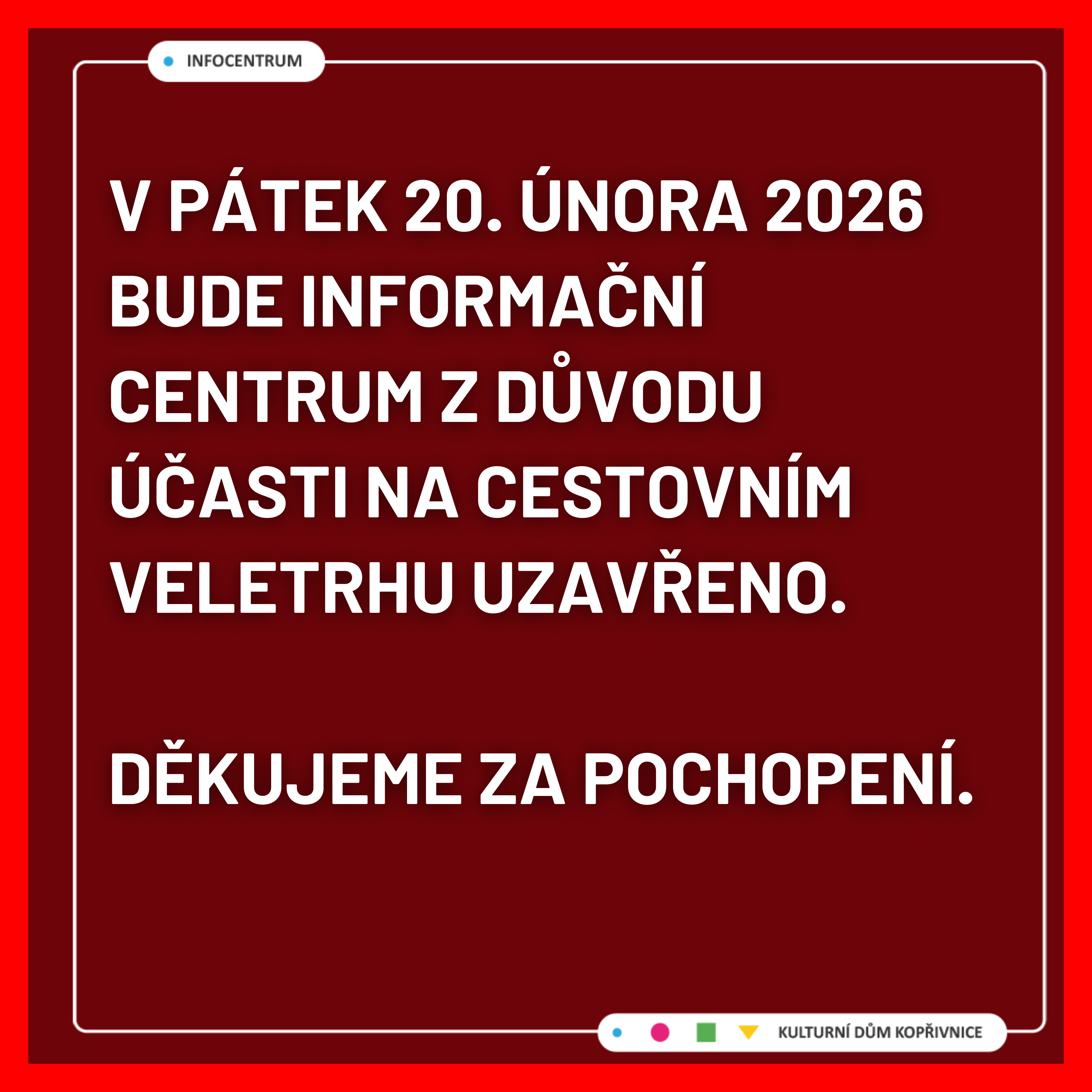 v pátek 20. února 2026 bude Informační centrum Kopřivnice mimořádně uzavřeno z důvodu účasti našich pracovníků na cestovním veletrhu.