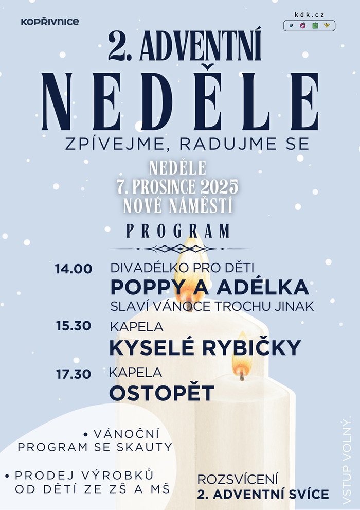 Srdečně Vás zveme na pokračování adventních oslav, kdy společně rozsvítíme druhou adventní svíci a prožijeme kouzelné předvánoční chvíle. Program zahájí divadélko pro děti Poppy a Adélka – slaví Vánoce trochu jinak. O hudební atmosféru se postarají kapely Kyselé rybičky a Ostopět, které rozezní náměstí energetickou muzikou. Drobné dárečky si budete moct zakoupit od dětí ze ZŠ Milady Horákové. Děti se mohou těšit na program, který pro ně připraví kopřivničtí skauti.