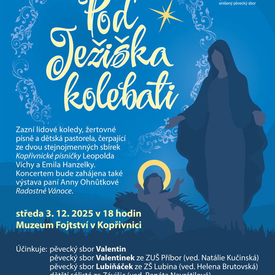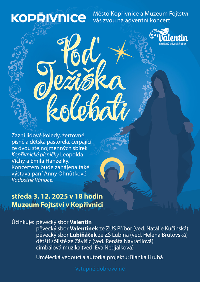 Program nabídne regionální koledy a písně z okolí Kopřivnice i Příbora, inspirované sbírkami Emila Hanzelky a Leopolda Víchy. Spolu se sborem vystoupí i dětské soubory Valentinek, Lubiňáček a zpěváci ze Závišic, kteří představí novou dětskou pastorelu Poď Ježiška kolebati. Koncert navodí atmosféru adventu i radostného očekávání Vánoc.