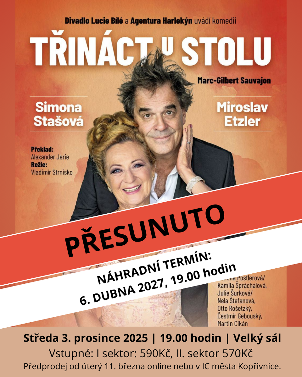 divadelní komedie TŘINÁCT U STOLU, která měla proběhnout ve středu 3. 12. 2025 je ze zdravotních důvodů přeložena na náhradní termín 6. 4. 2027 v 19:00 hodin (na rok 2026 bohužel nebyl náhradní termín možný).