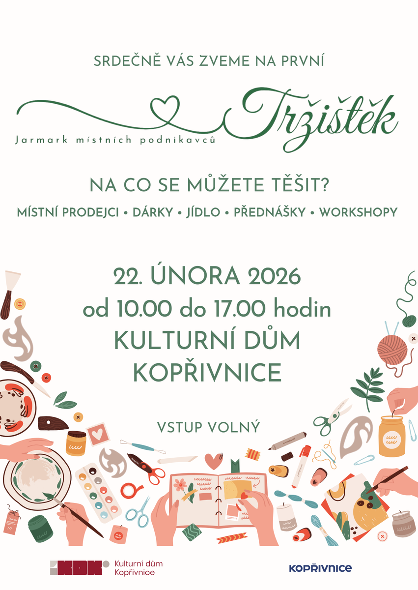 Místní prodejci s vlastně vyrobenými produkty, přednášky, workshopy nebo také něco dobrého k jídlu a pití - to vše v prostorách Kulturního domu Kopřivnice.